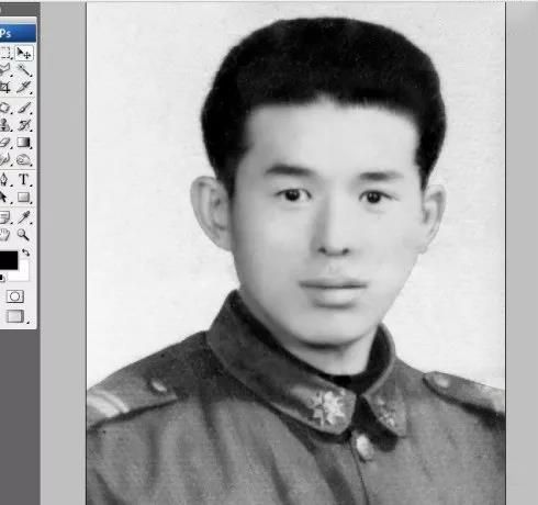 6、用手指涂抹工具拉头发丝和拉眉毛是一样的,要用细小的像素画笔,强度合适,参考下图。在整个旧照翻新的过程中,手指涂抹工具在皮肤上一定要少用甚至不用,因为它能让皮肤纹理模糊没质感了。